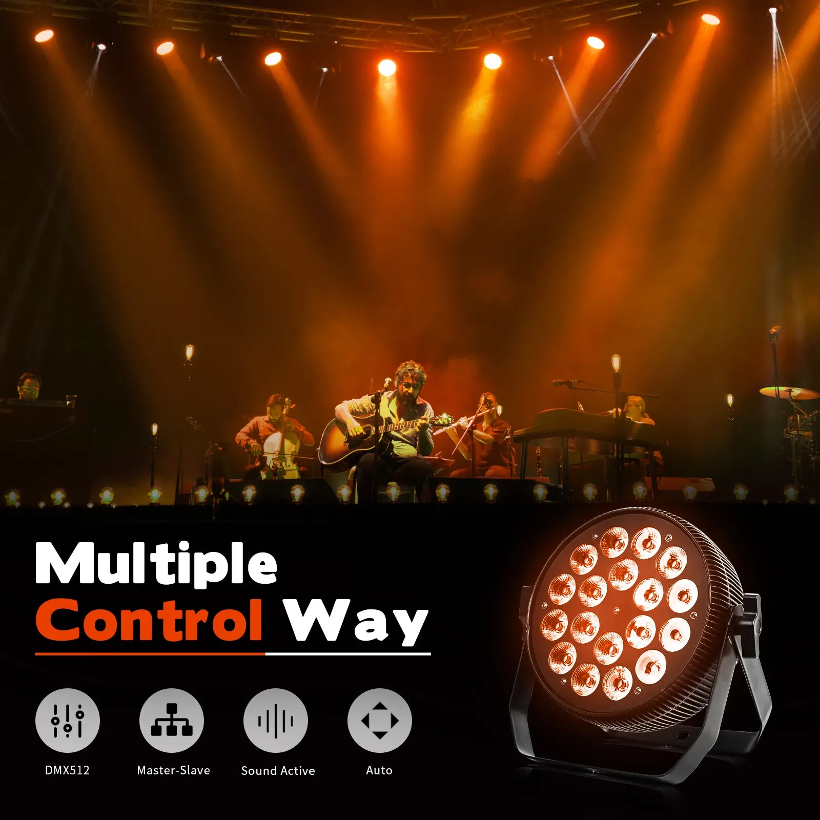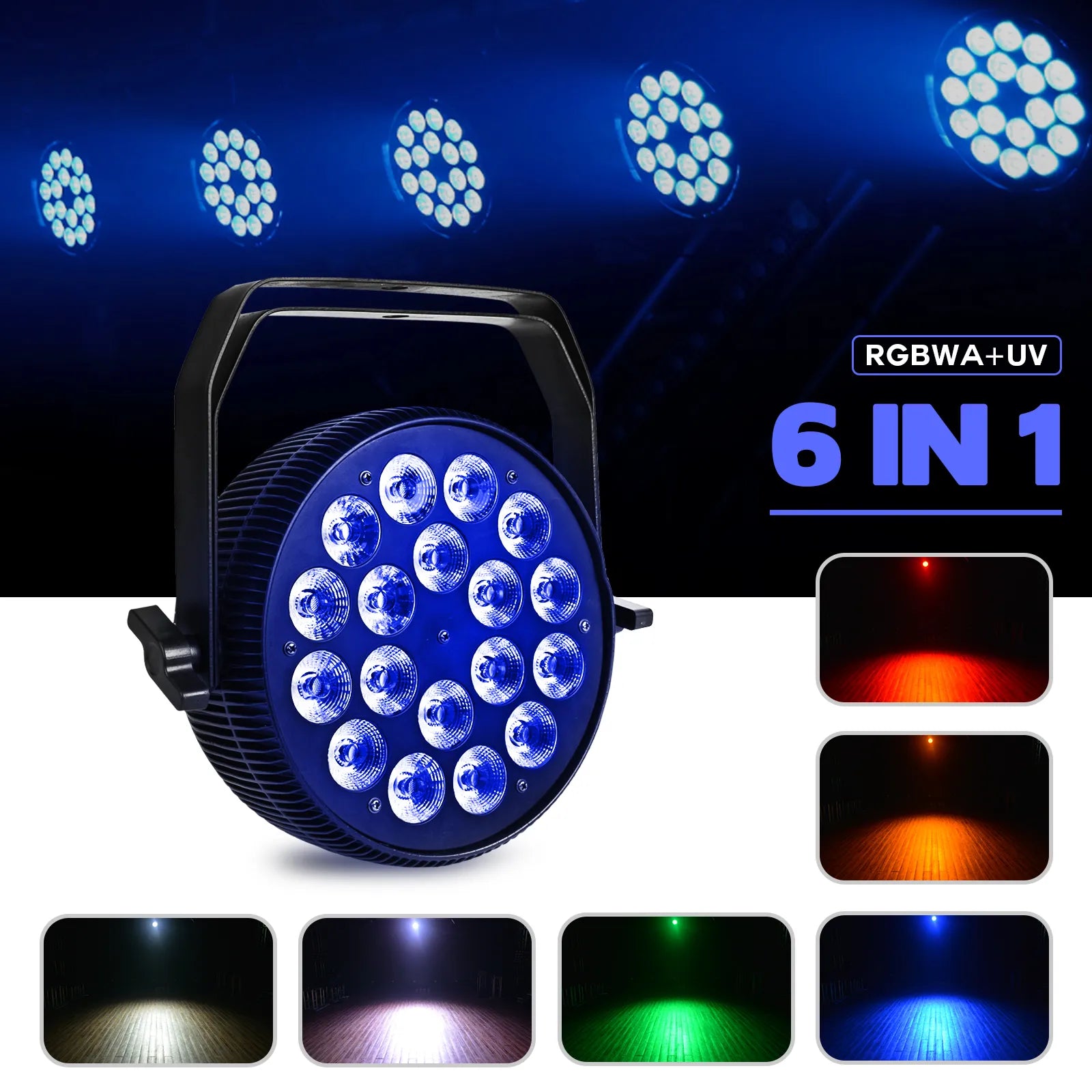• 18pcs 18w RGBWA+UV 6 in 1 high brightness light source.