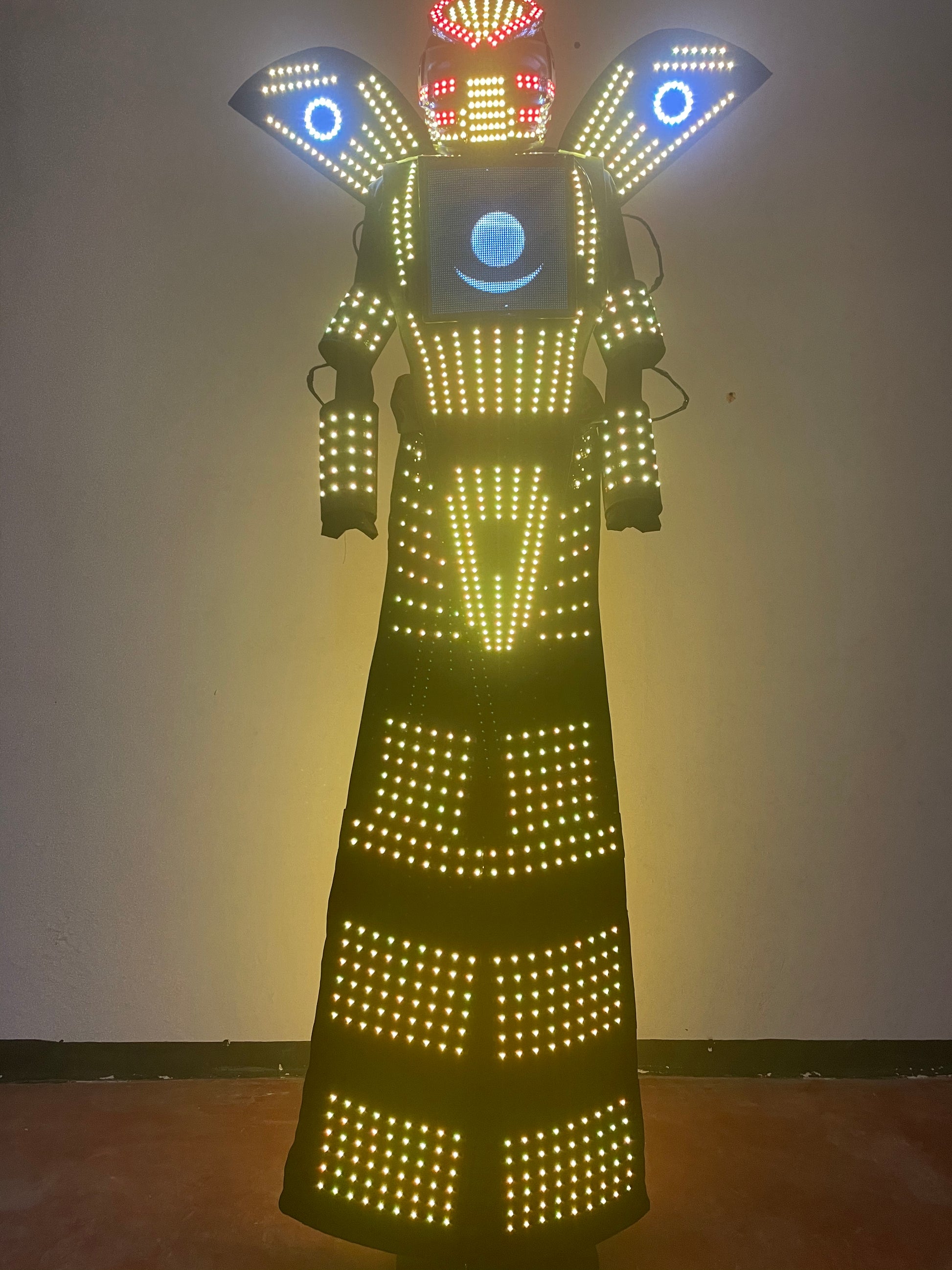 - Este traje LED utiliza un control remoto para cambiar el color y la frecuencia de parpadeo.