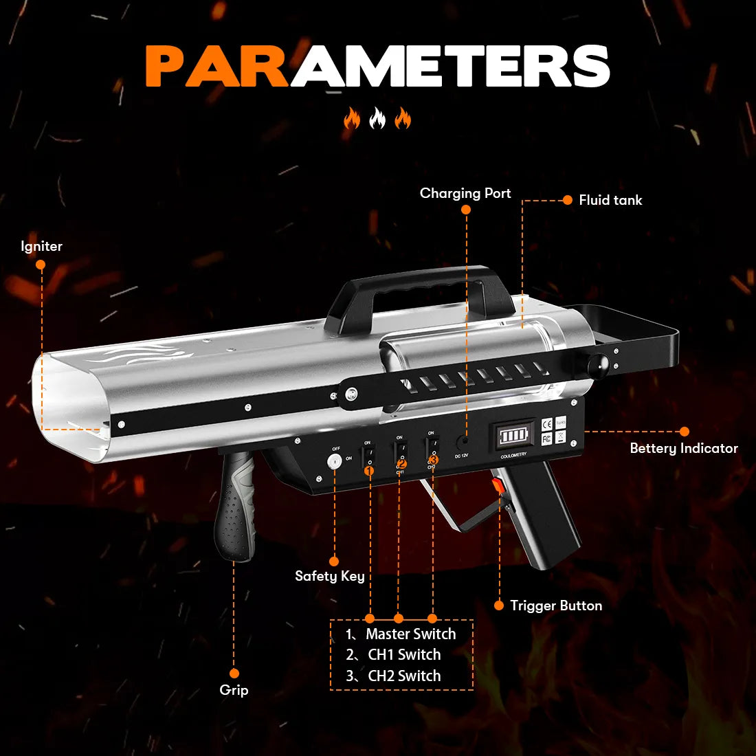 - Be careful to stay away from crowds due to the real flames that the machine emitsIt is forbidden to spray at any person or object.