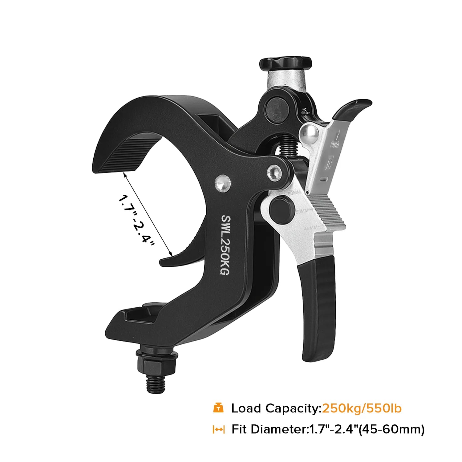 - TÜV Certified Safety & Premium Aluminum Build – Engineered for reliability, our lighting truss hook is crafted from high-strength aluminum alloy, ensuring long-lasting durability and peace of mind under heavy loads up to 250kg / 550lb.