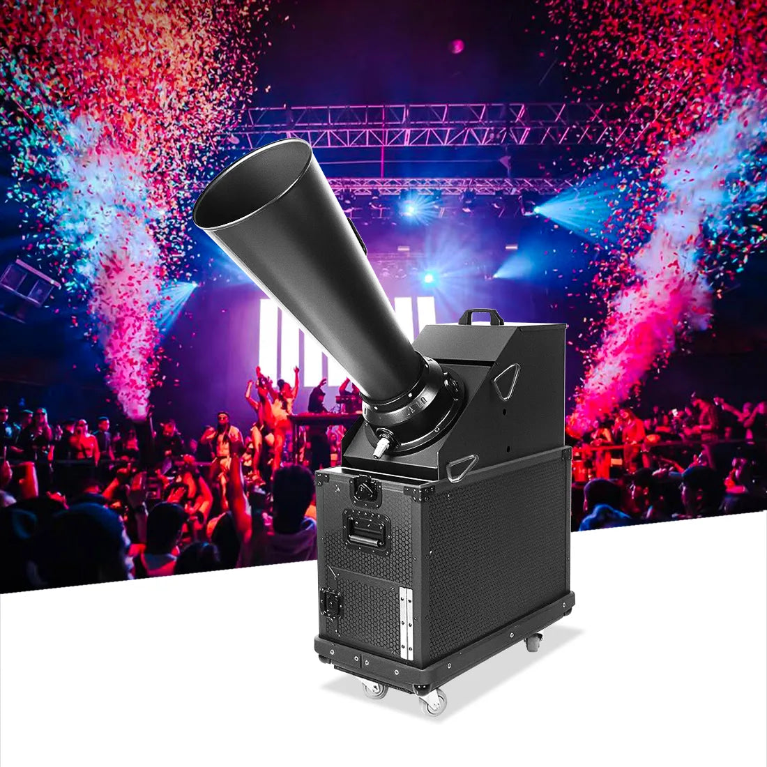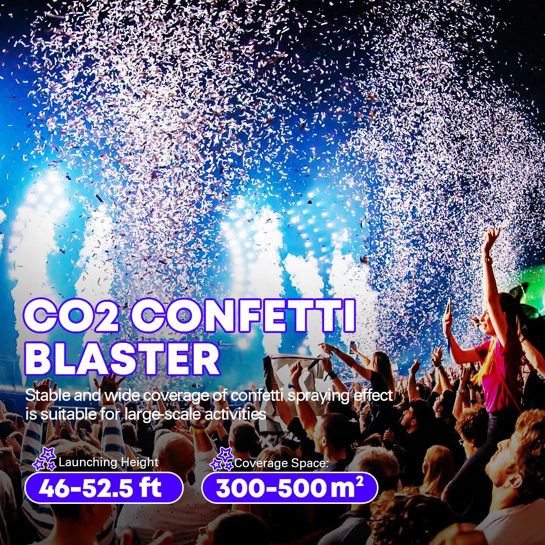 • Confetti cannon machine with DMX control, the range can reach about 10-15 meters, covering an area of up to 300 square meters.
