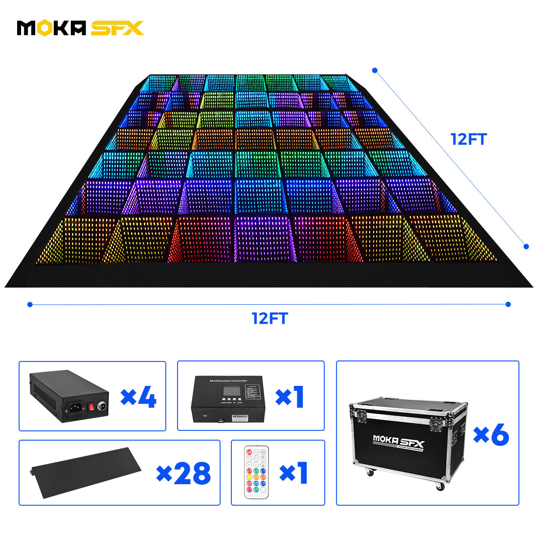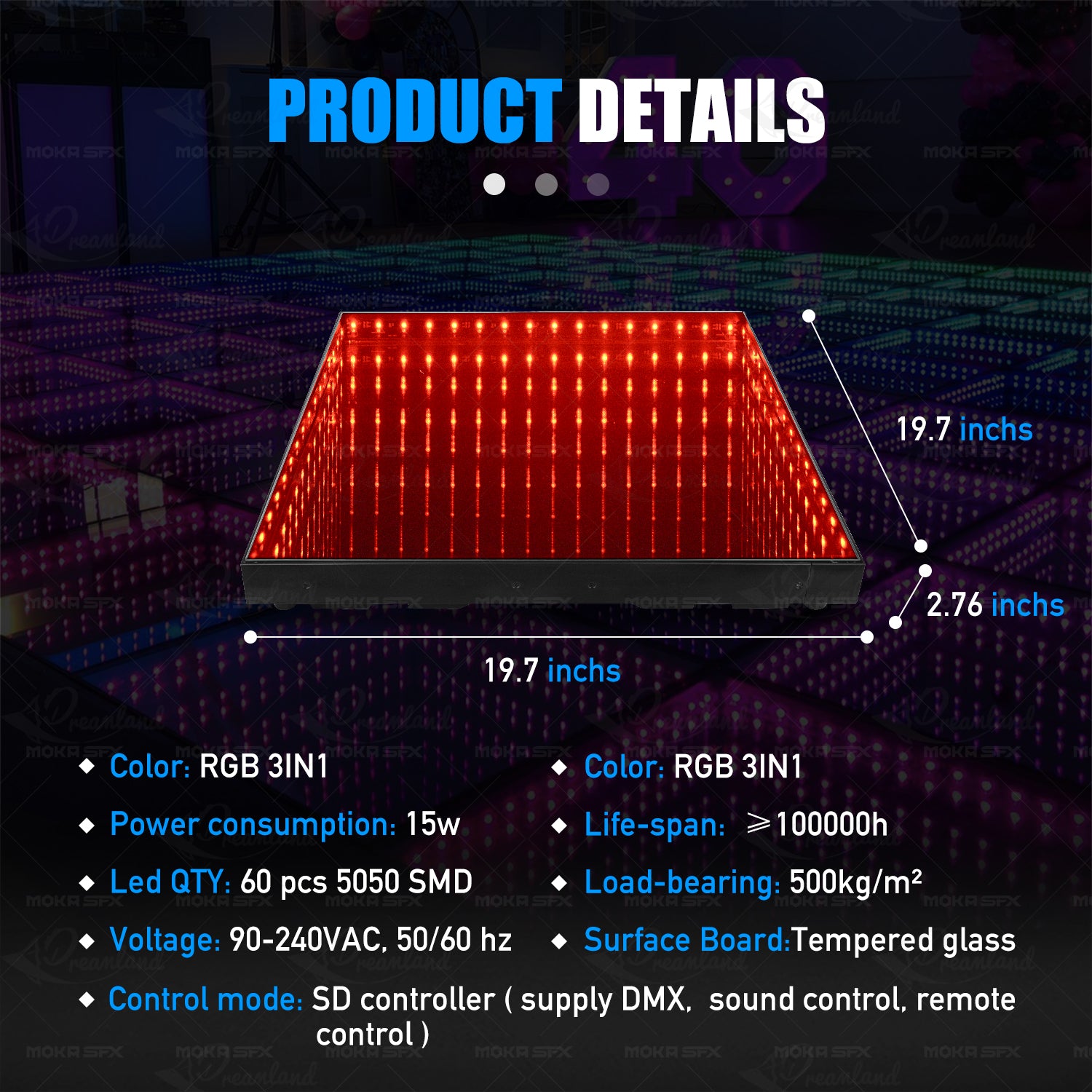 The size of each tile of the magnet model is 50*50*7cm. If you wish to customize the size and area of the floor tile lights according to your venue, please contact our customer service.