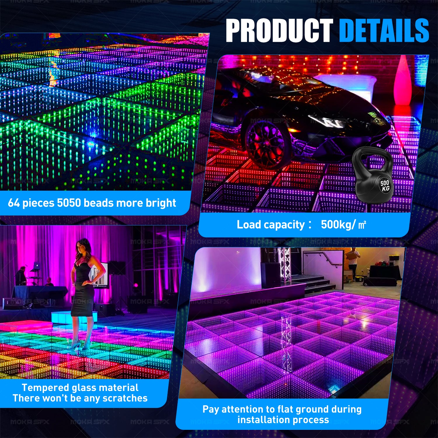 A: The LED dance floor tile lights are made of durable double-layer tempered organic glass material, nearly shatterproof, sturdy, and scratch-resistant, capable of bearing up to 500 kg/m². Each tile weighs 12 kg and is highly scratch-resistant, but caution is needed for gravel on shoe soles.